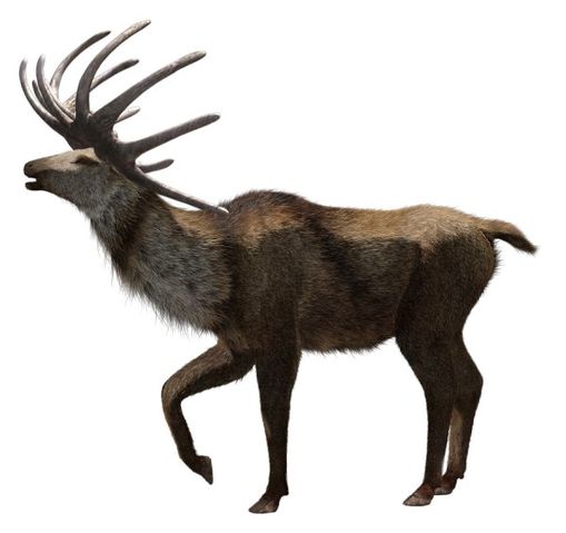 harenes de hembras tras luchar a cornadas con otros machos. Durante la época de celo, los machos ayunaban para concentrarse en el celo, por lo que muchos de ellos morían. Aunque no se han encontrado evidencias de pelo, se sabe a partir del arte rupestre el color que tuvo este cérvido: pardo o rojizo en verano y pardo oscuro con fragmentos amarillentos en invierno. Megaloceros fue un mamífero de dieta herbívora. Se dedicaba a pastar abundante hierba y también arbustos. Durante el invierno, es probable que migrasen en manadas hacia zonas meridionales dentro de su territorio, aunque podían darles caza múltiples cazadores como el León de las Cavernas, el Hombre de Neandertal y el Hombre Moderno, además de lobos, hienas y osos. Los ciervos de este género vivieron en las estepas abiertas y en las tundras y no en bosques cerrados ya que sus astas se habrían quedado enredadas con las ramas. Megaloceros fue el mayor cérvido de la Historia. Se conoce, como hemos dicho antes, con el nombre de Alce Irlandés porque aunque se descubrió en toda Europa y parte de Asia se han descubierto muchos de estos ejemplares en Irlanda. Se extinguieron por muchas diferentes causas, aunque consta decir que después de las glaciaciones la especie menguó en número rápidamente.